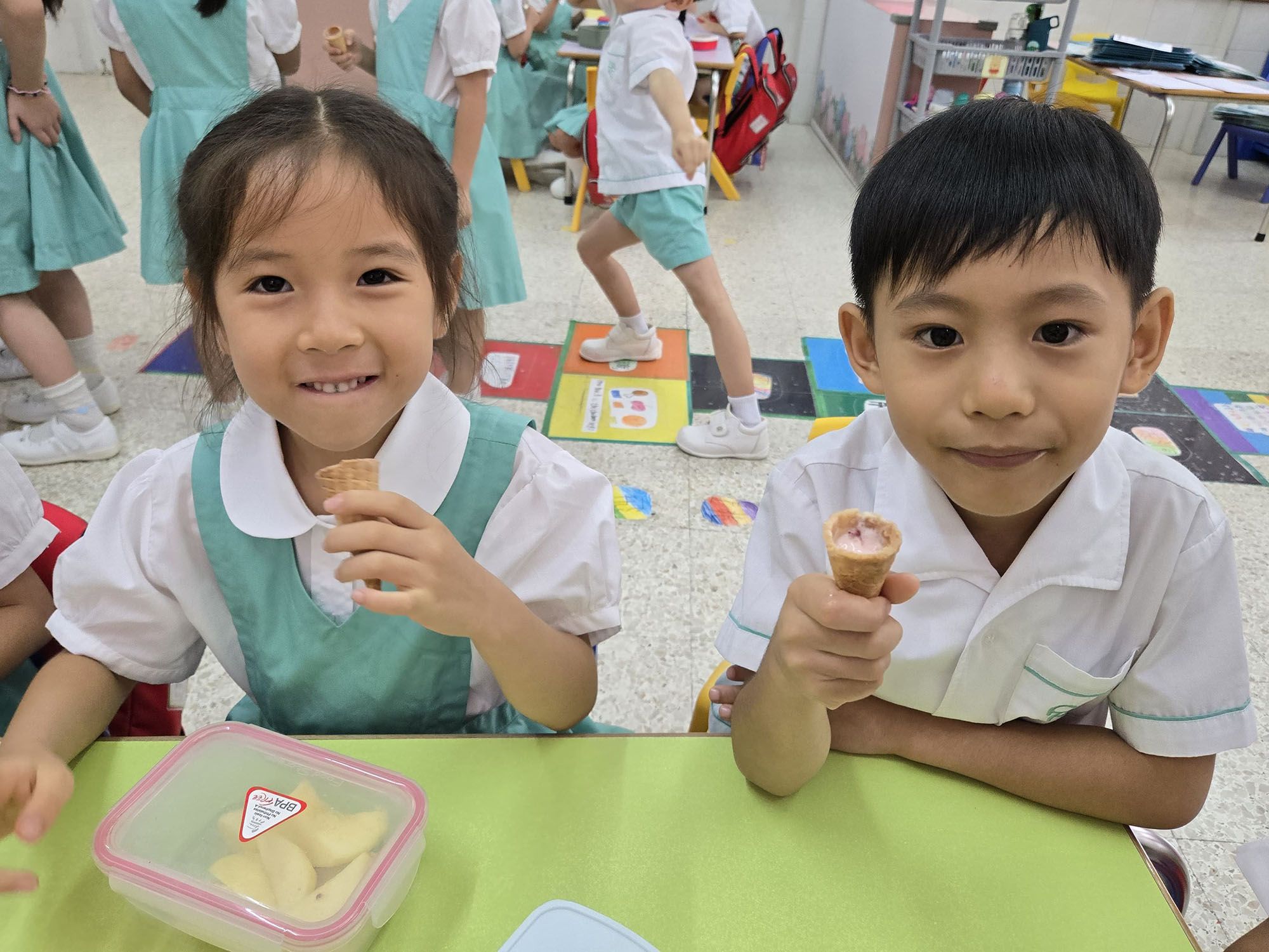 In questo giorno gioioso, abbiamo condiviso con i bambini un gelato alla fragola. Attraverso la polpa rossa della fragola, i bambini hanno ricordato che il rosso simboleggia la gratitudine per l'amore di Gesù, che ha versato il suo prezioso sangue per noi e ha condiviso con noi il suo amore. I bambini erano molto felici! Mentre mangiavano il gelato, hanno espresso la loro gratitudine per l'amore di Gesù.
