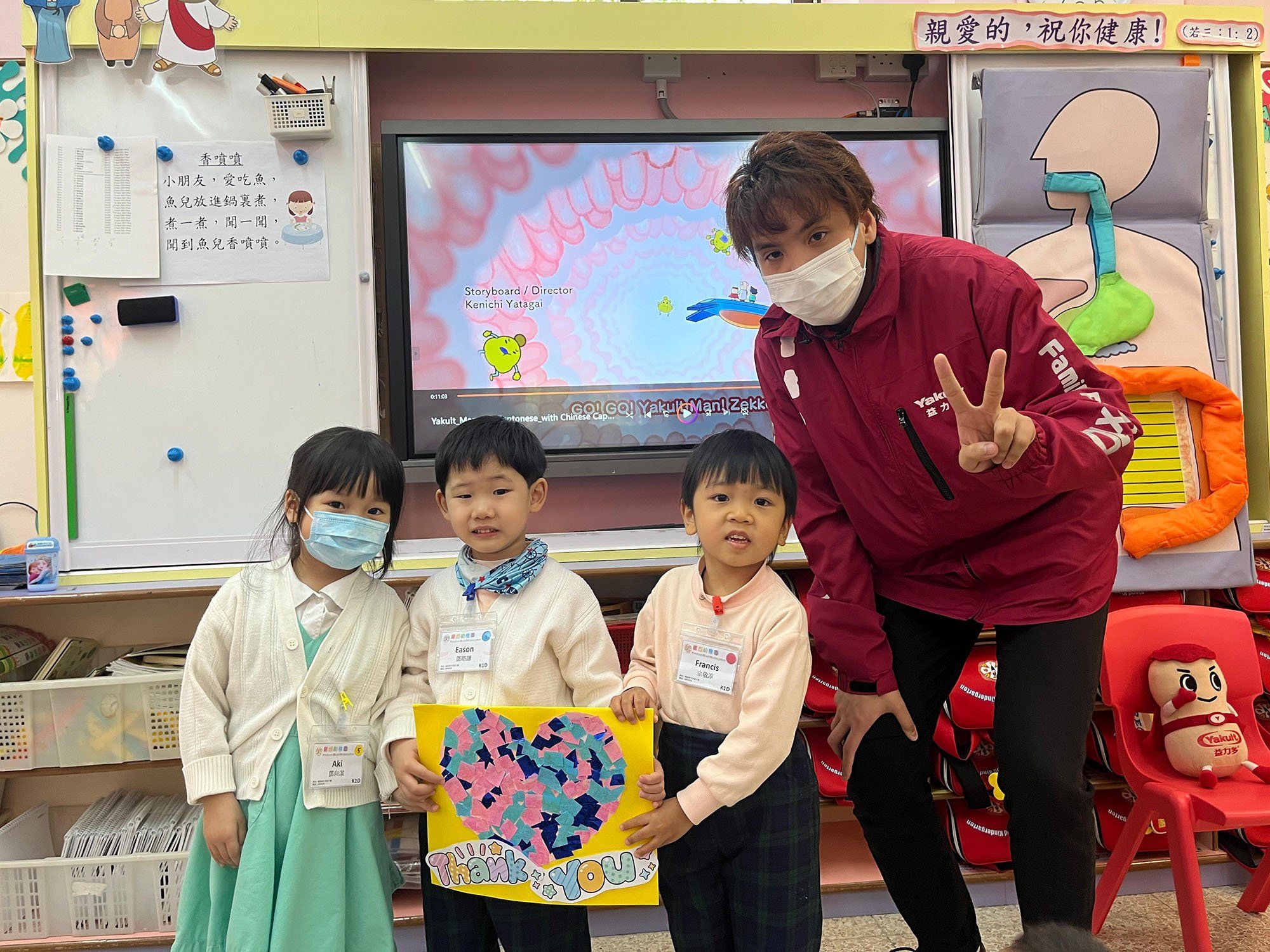 幼稚園のクラステーマ「お姫様が病気」に合わせ、香港ヤクルト乳業株式会社は2025年4月8日(火)に当校を訪問し、幼稚園児を対象に「健康な食生活講座」を実施しました。当日は、講師が模擬人体器官の材料を使用し、子どもたちに消化器官の構造について基本的な理解を促すため、健康な腸の重要性について説明しました。また、健康な食事と排便の関係を説明し、さまざまな健康な食事習慣を共有しました。さらに、腸の働きを分かりやすく理解するための楽しいアニメーションも用意され、プロバイオティクスが消化を促進し免疫力を高める仕組みを明確に認識させ、健康な食事の重要性を深く理解させました!子どもたちは学習プロセスに積極的に参加し、講師への感謝の意を表すために特別に感謝のカードを制作しました。