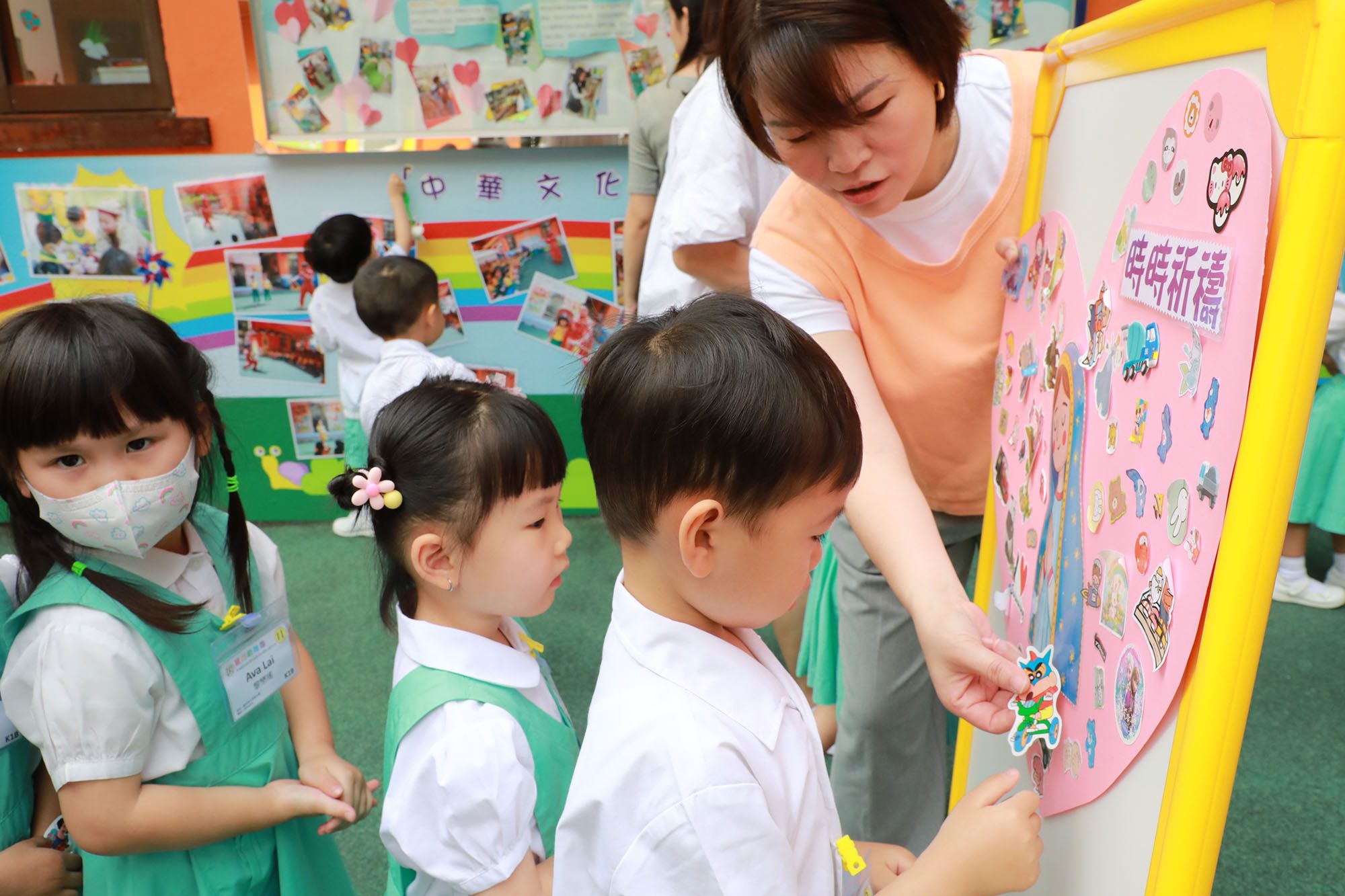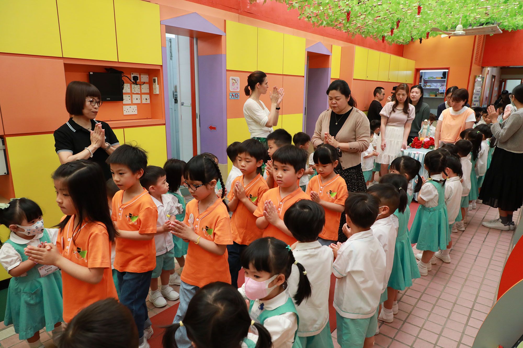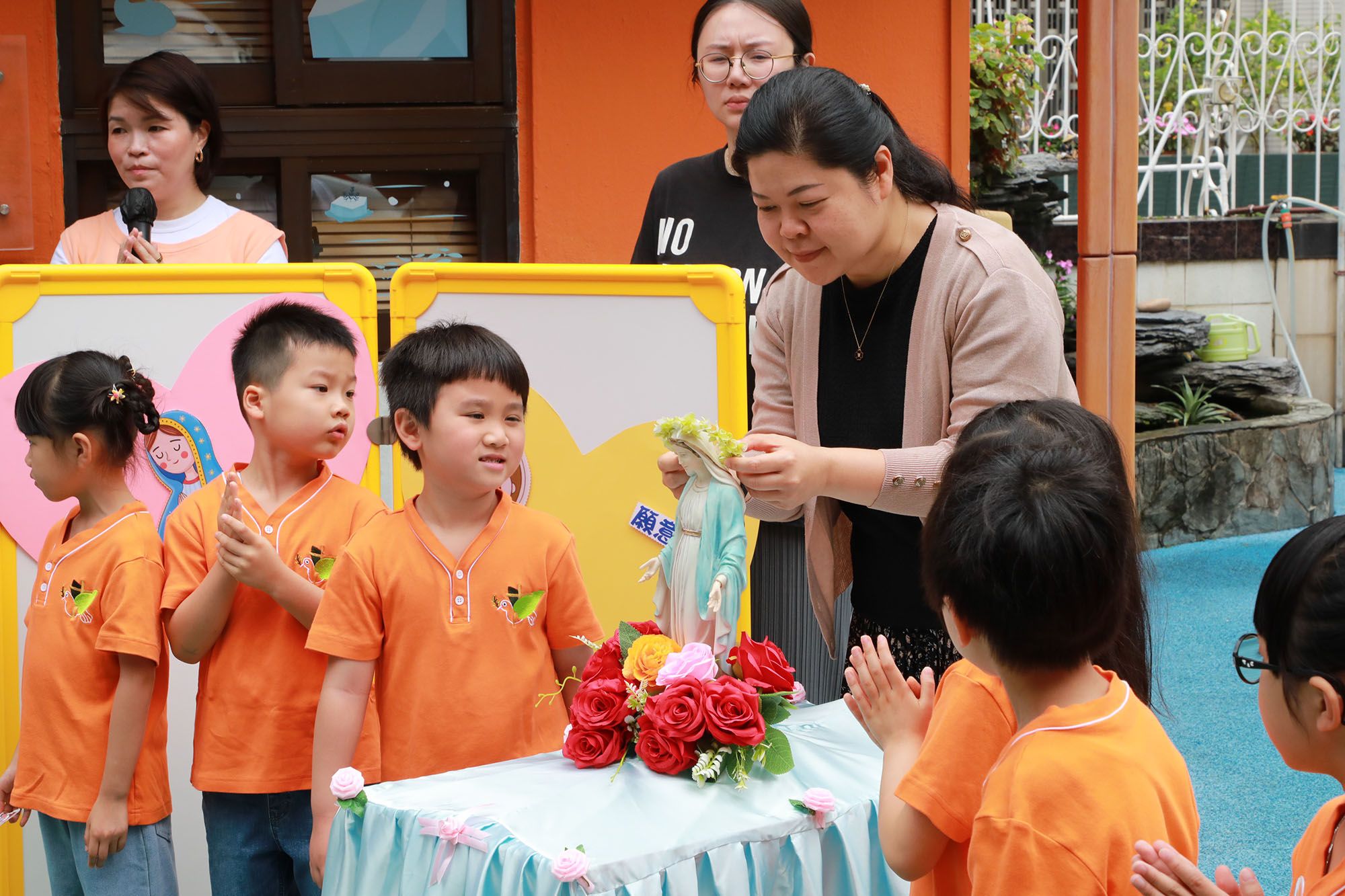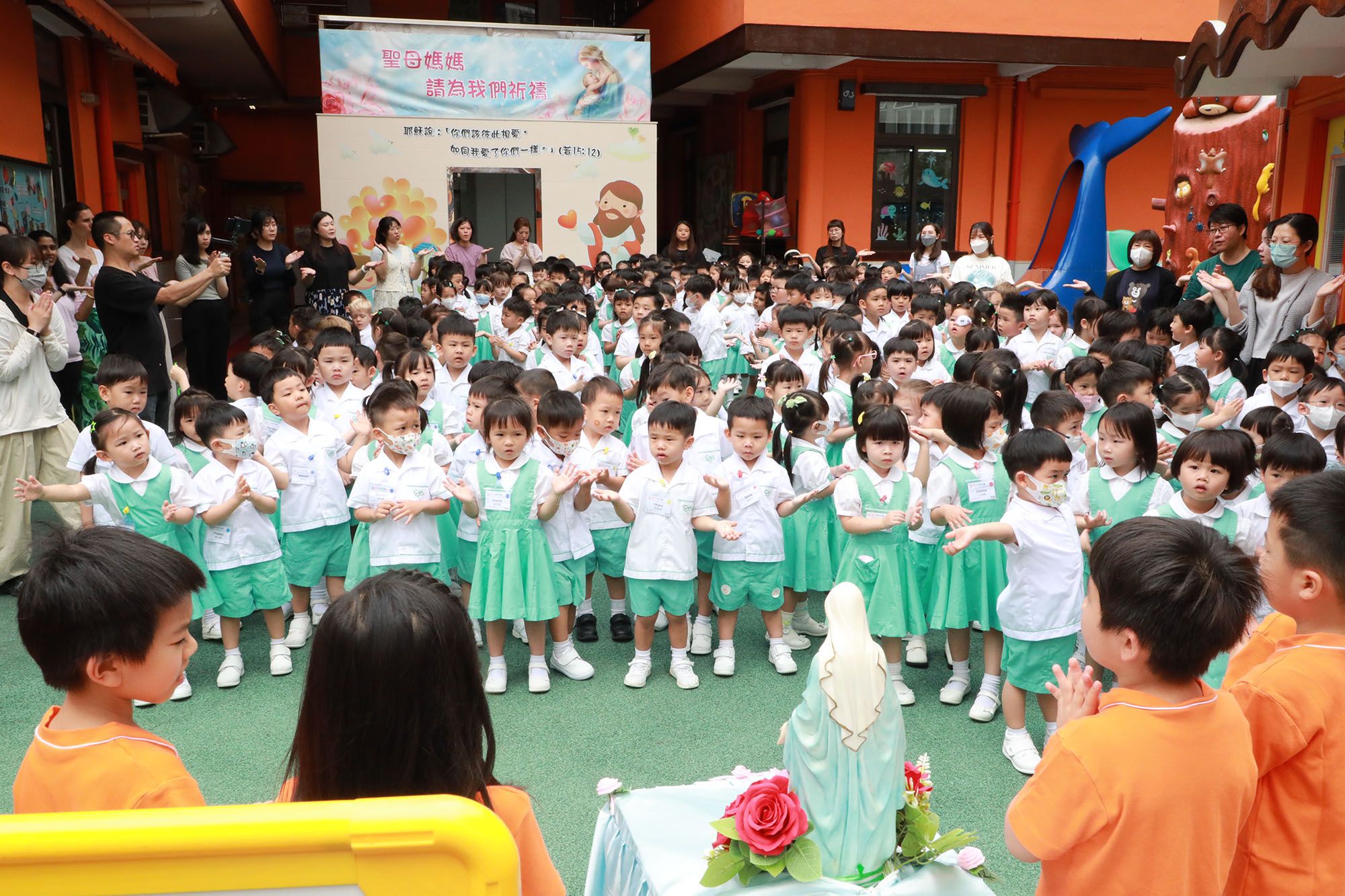 5월은 성모님의 달입니다. 성모님에 대한 경배와 사랑을 표현하기 위해 우리 학교는 5월 13일(화요일)에 성모님 달 경배 활동 – 성모님 상 행렬을 진행했습니다. 마 교장과 기독교 작은 씨앗 대표들이 이끌어 성모님 상은 다이내믹 놀이터에서 복도를 거쳐 최종적으로 학교 놀이터로 이동했습니다. 모든 교직원과 학생들은 성모님의 행렬을 따라가며 화려하고 인상적인 장면을 연출했습니다. 행렬 중에는 부모님의 뜻을 위해 기도하며 “파티마의 성모님”, “성모님은 아이들을 사랑하십니다”, “중국의 성모님” 등 성가곡을 부르며 성모님께 감사와 찬양을 드렸습니다. 아이들은 성모 마리아에게 존경을 표하는 의미로 가장 소중히 여기는 스티커를 바쳤으며, 그녀의 덕목을 본받아 일상 생활에서 행동으로 응답하겠다고 약속했습니다. 또한 성모 마리아에 대한 효심을 표현하기 위해 진심 어린 키스와 날아가는 키스를 선사했습니다.