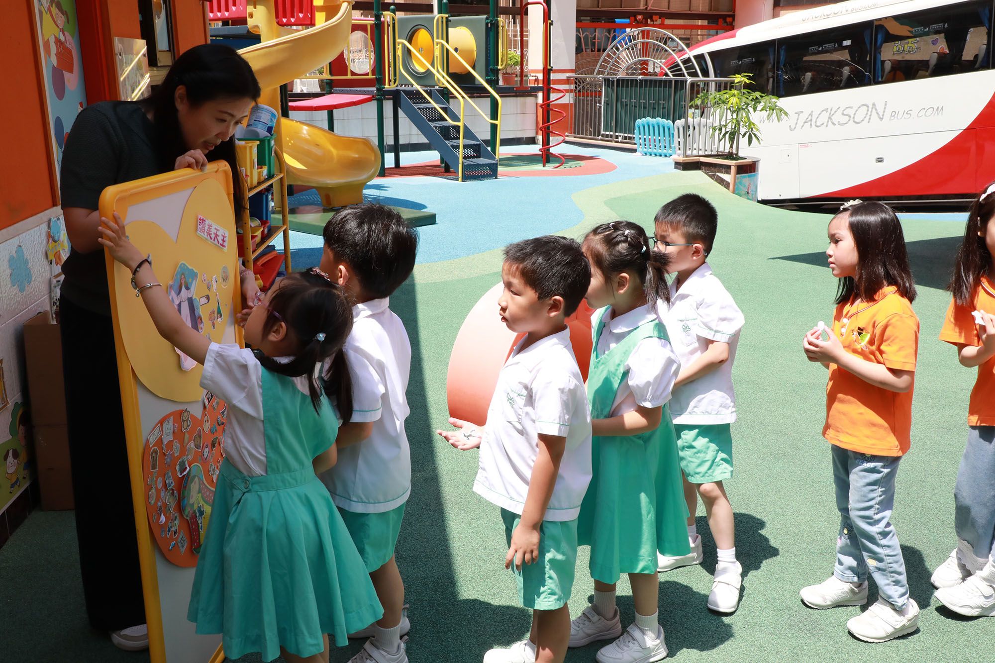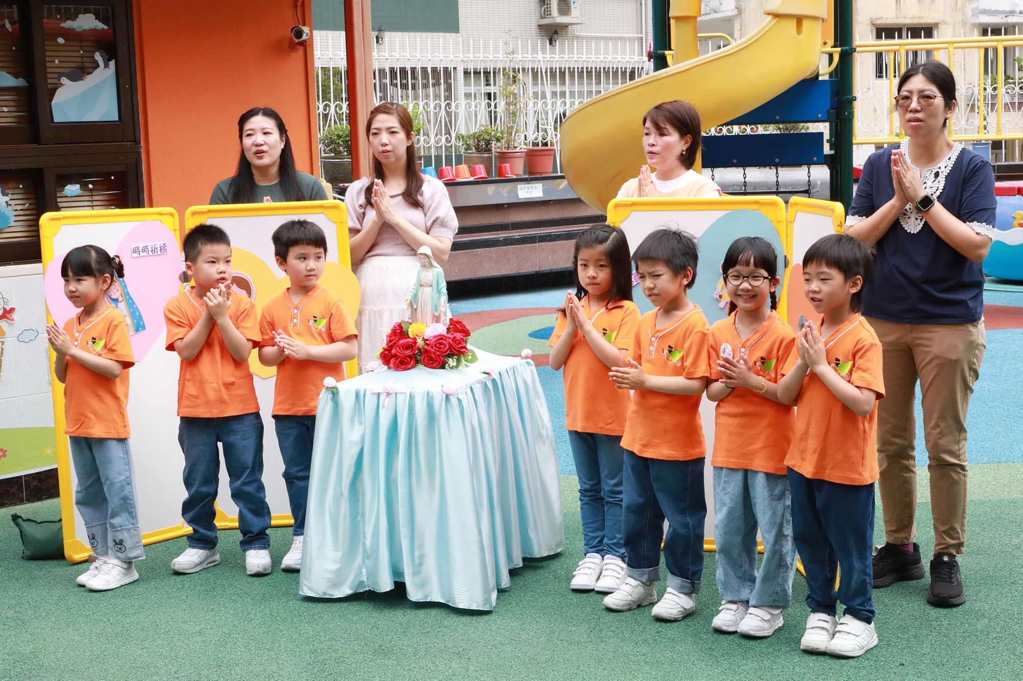 五月是聖母月,為表示我們對聖母的孝愛,本校於五月十三日(星期二)舉行了聖母月敬禮活動-聖母像巡遊。由馬校長及基督小幼苗代表領路,護送聖母像,由動感樂園出發,經過走廊,最後到學校操場,全校師生跟隨聖母座駕前進,場面壯觀。沿途一同為家長的意向祈禱及詠唱「法地瑪聖母」、「聖母心裡愛孩子」、「中華聖母」感謝和讚頌聖母。幼兒帶了自己最心愛的貼紙,獻給聖母瑪利亞,以表敬意,並應承聖母效法她的德行,在生活中以行動去回應,幼兒還送上心心和飛吻表達對聖母的孝愛。