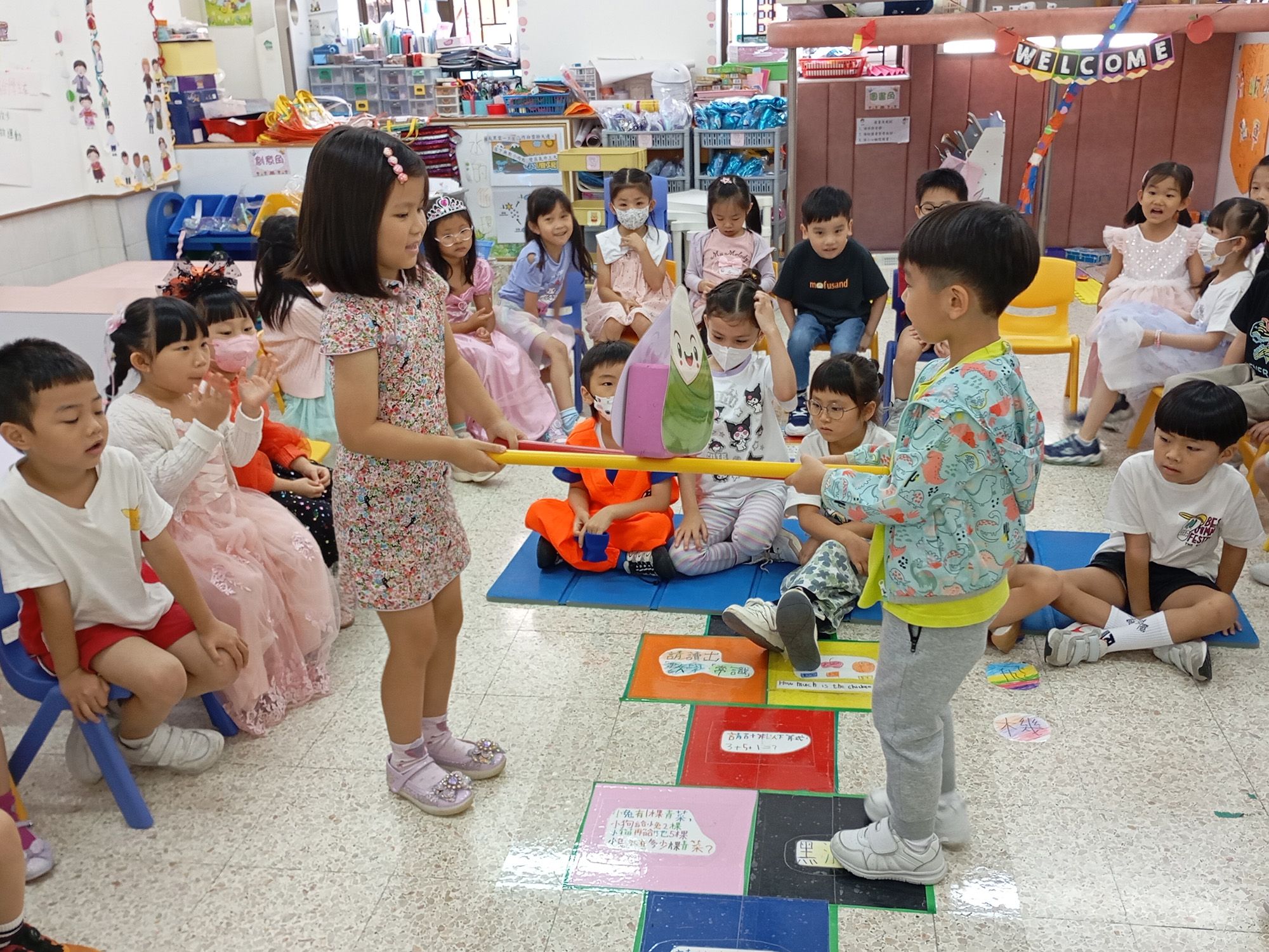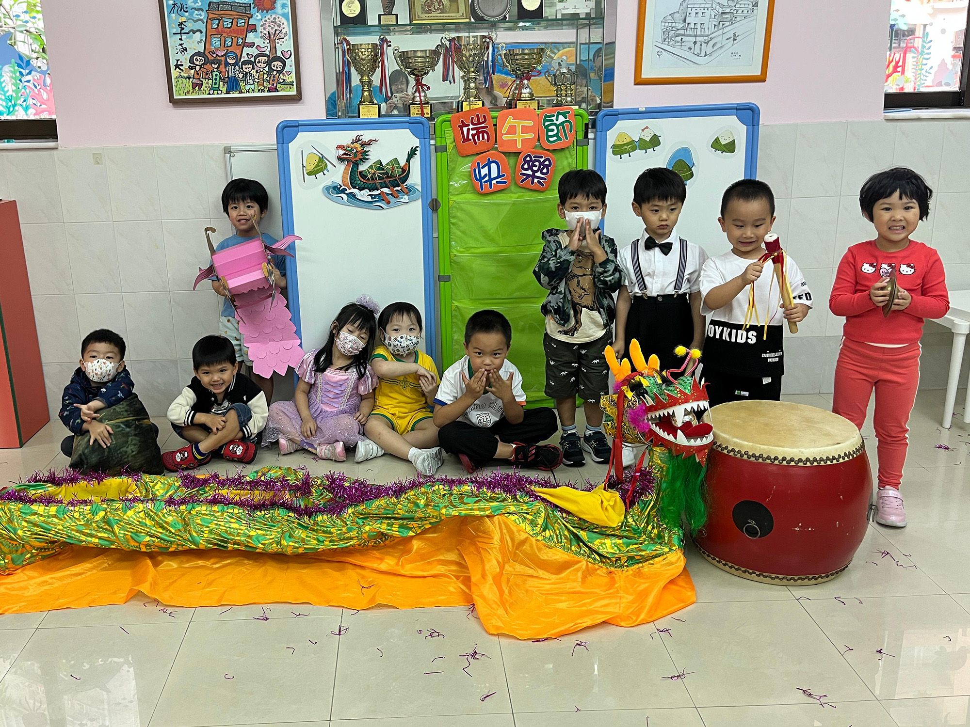 端午節(5月30日)前夜、幼稚園では誕生日会を兼ねた「ドラゴンボートレース祝賀会」を開催。園児たちは童謡や物語を通して、この祝日の由来と意義を学びました。ドラゴンボート漕ぎや粽(ちまき)リレーなどのゲームに参加し、先生方が実演した粽の包み方を真似て、皆で味わうことで、この祝日の文化的伝統を体験しました。5月と6月生まれの園児たちの誕生日写真を撮影し、お祝いを行いました。
