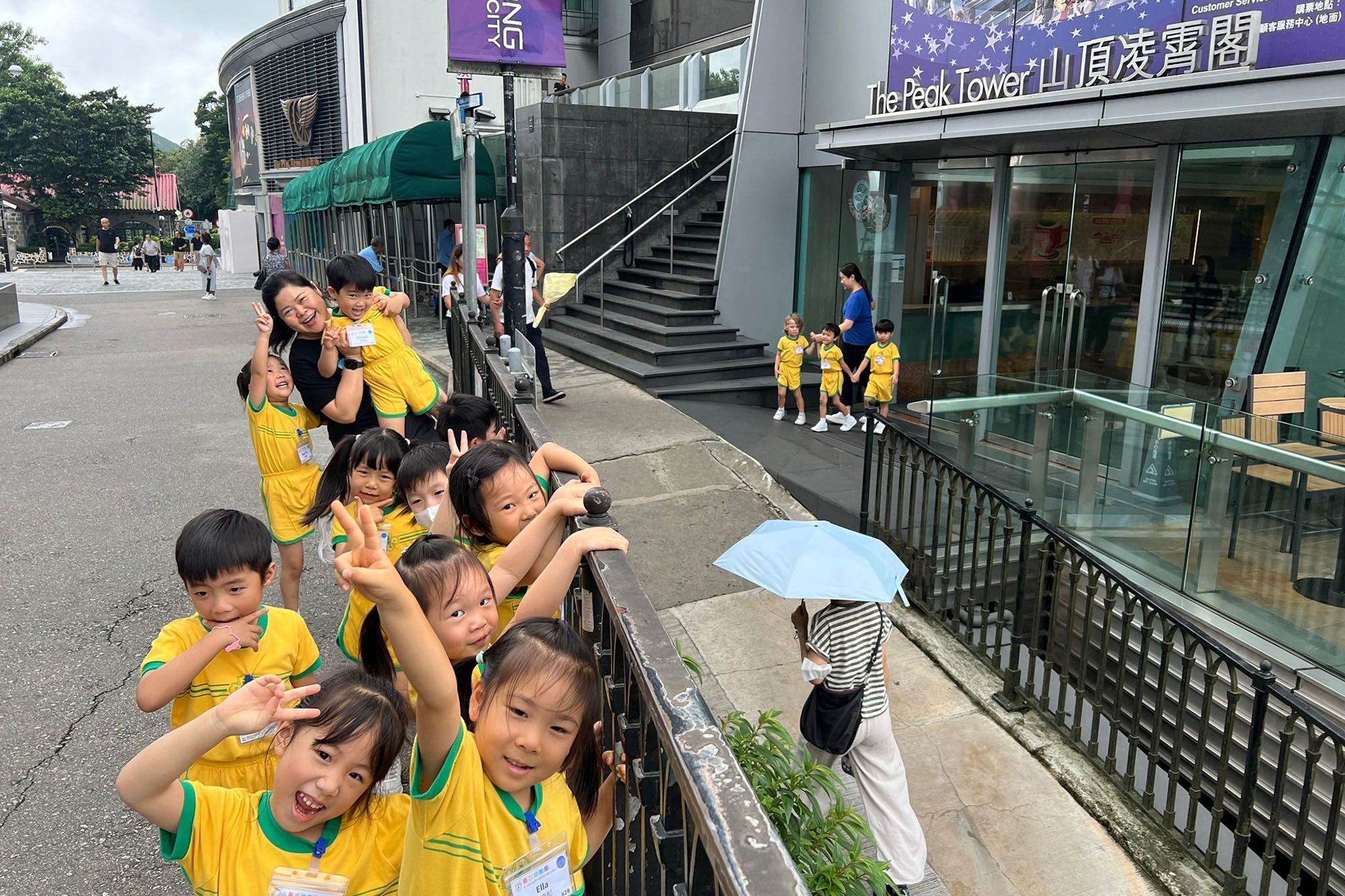 当日は、ケーブルカーでゆっくりと山を登り、途中の壮観な山々の景色を楽しみました。子どもたちは大変興奮していました!山頂に到着後、有名なピークタワーを訪れ、香港の建築の独特な特徴を鑑賞し、記念写真撮影を行いました。子どもたちはまた、伝統的な中国建築の特徴を持つライオン・パビリオンを訪れ、香港のヴィクトリアハーバーの絶景を望む高台から景色を楽しみました。途中、子どもたちは様々な言語で観光客に挨拶し、香港へようこそと歓迎し、大きな勇気と自信を示しました!教師と子どもたちは、素晴らしい一日を共に過ごしました!